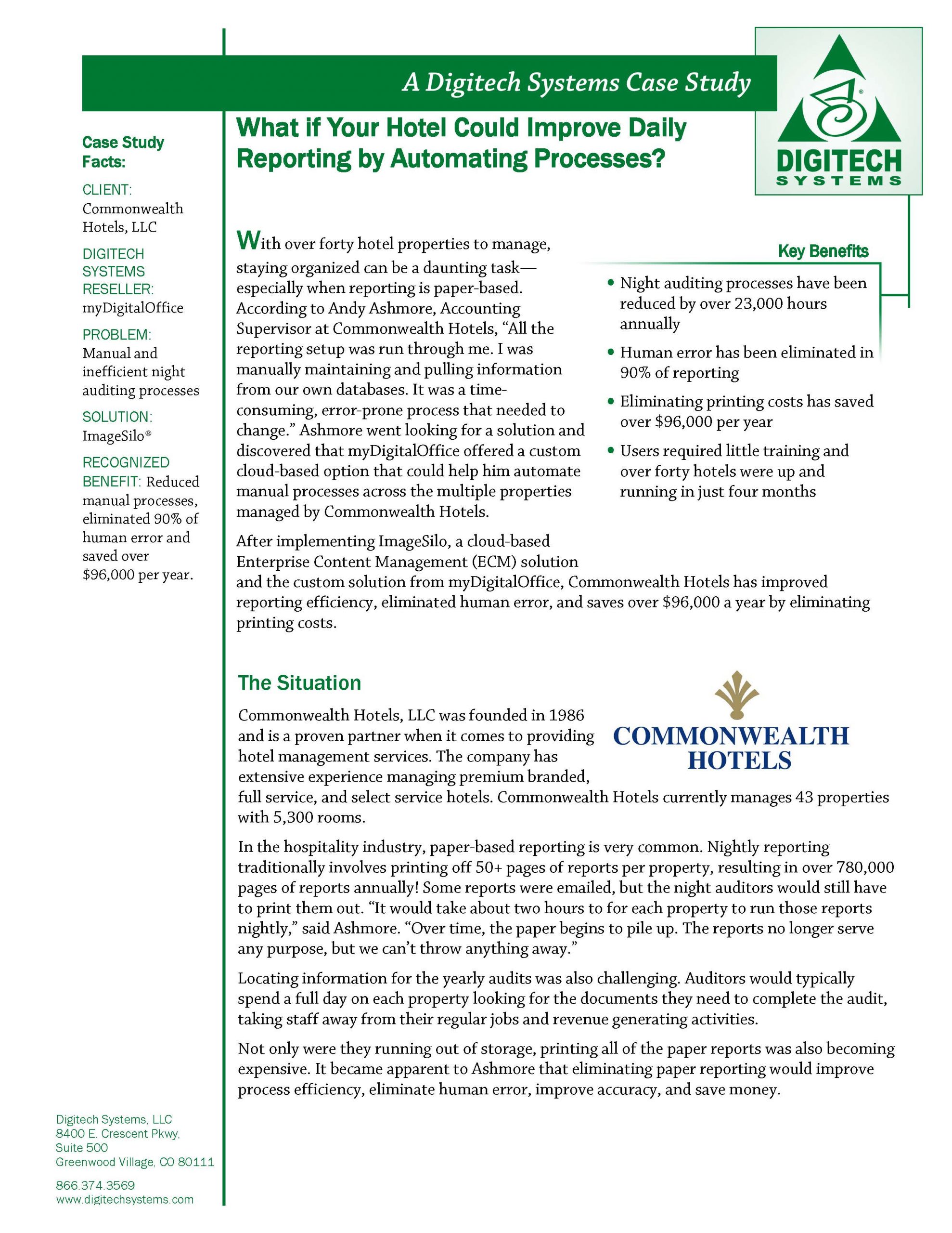 Commonwealth Hotels, LLC manages over 40 properties and as you can imagine, prints tons of paper! Over time, this paper piles up, audits become difficult, and storage space becomes scarce. Andy Ashmore, Accounting Supervisor decided it was time to be done with all that paper and went looking for a solution.