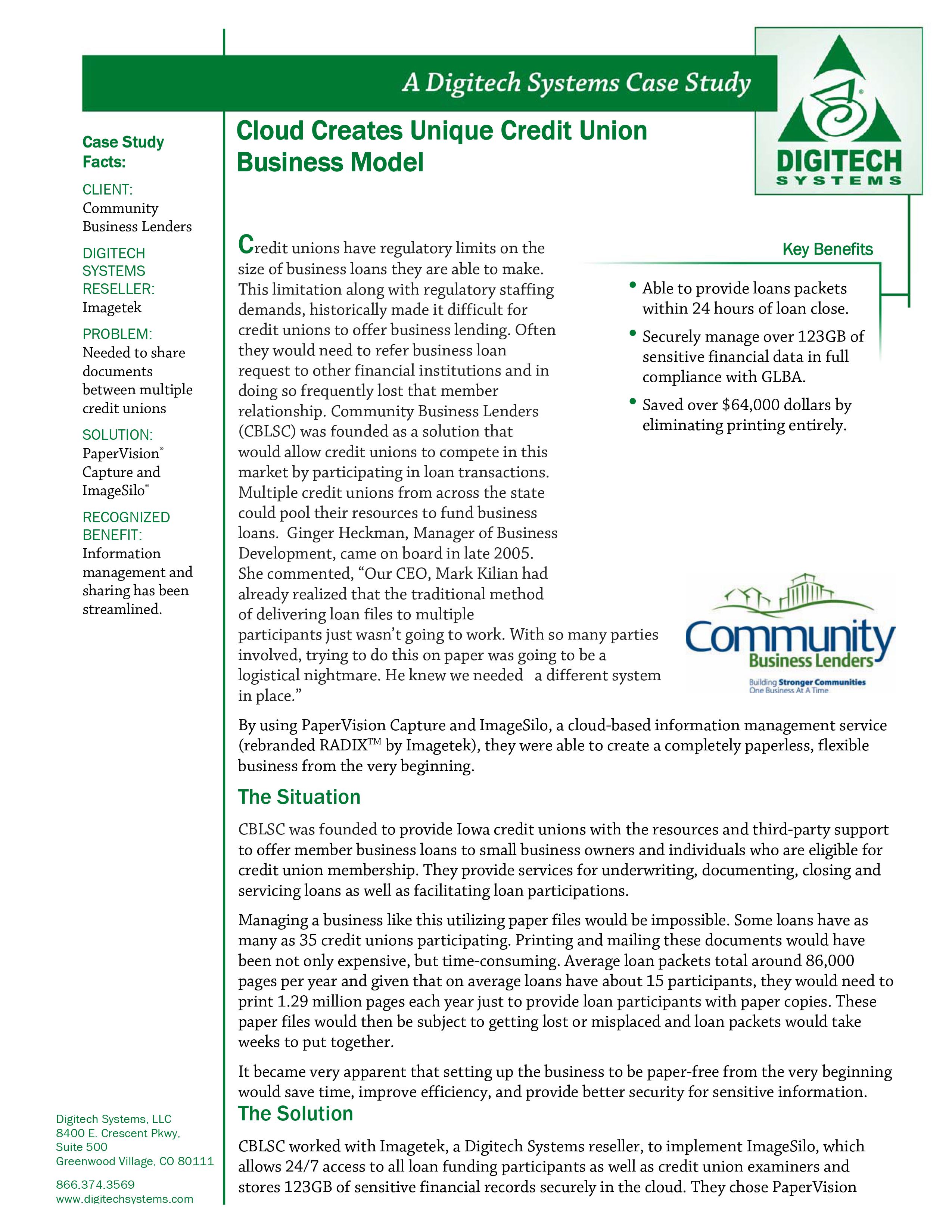 CBLSC worked with Imagetek, a Digitech Systems reseller, to implement PaperVision® Capture to scan loan documents into digital files and ImageSilo® to store the documents in the cloud. The company credits this digital transformation with helping set up a business model that is so successful the company is already branching out to other states.