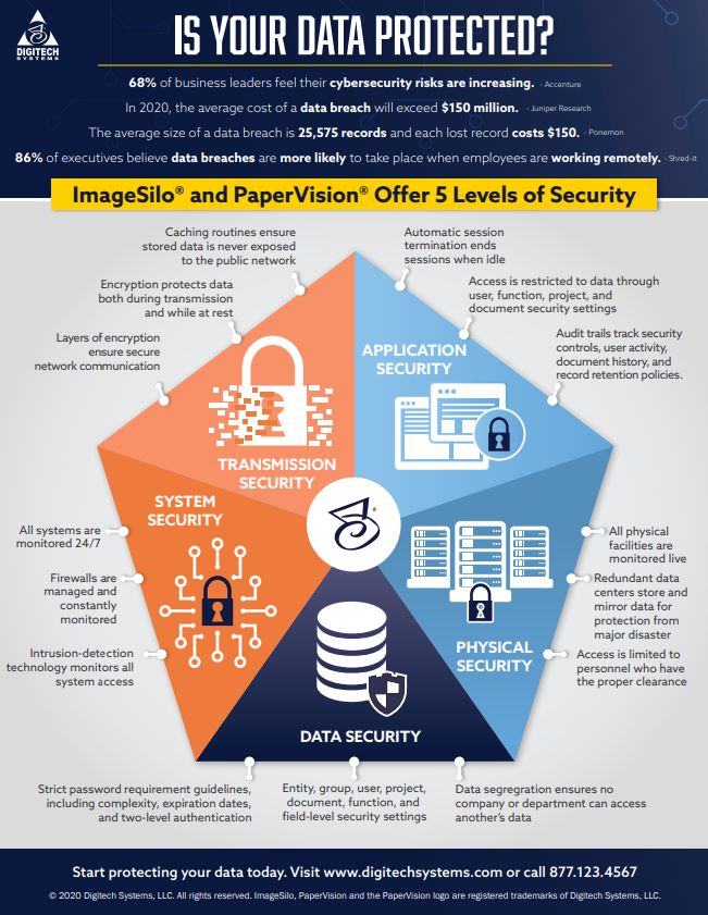 The rise of cyber attacks is pushing organizations to focus on implementing cyber security to reduce the risk of becoming a victim of a cyber emergency. Your organization can protect your data with cloud-based Enterprise Content Management (ECM) services, such as ImageSilo®. Learn about the five levels of security ImageSilo has to offer to ensure your information is secure at all times by clicking the image below.