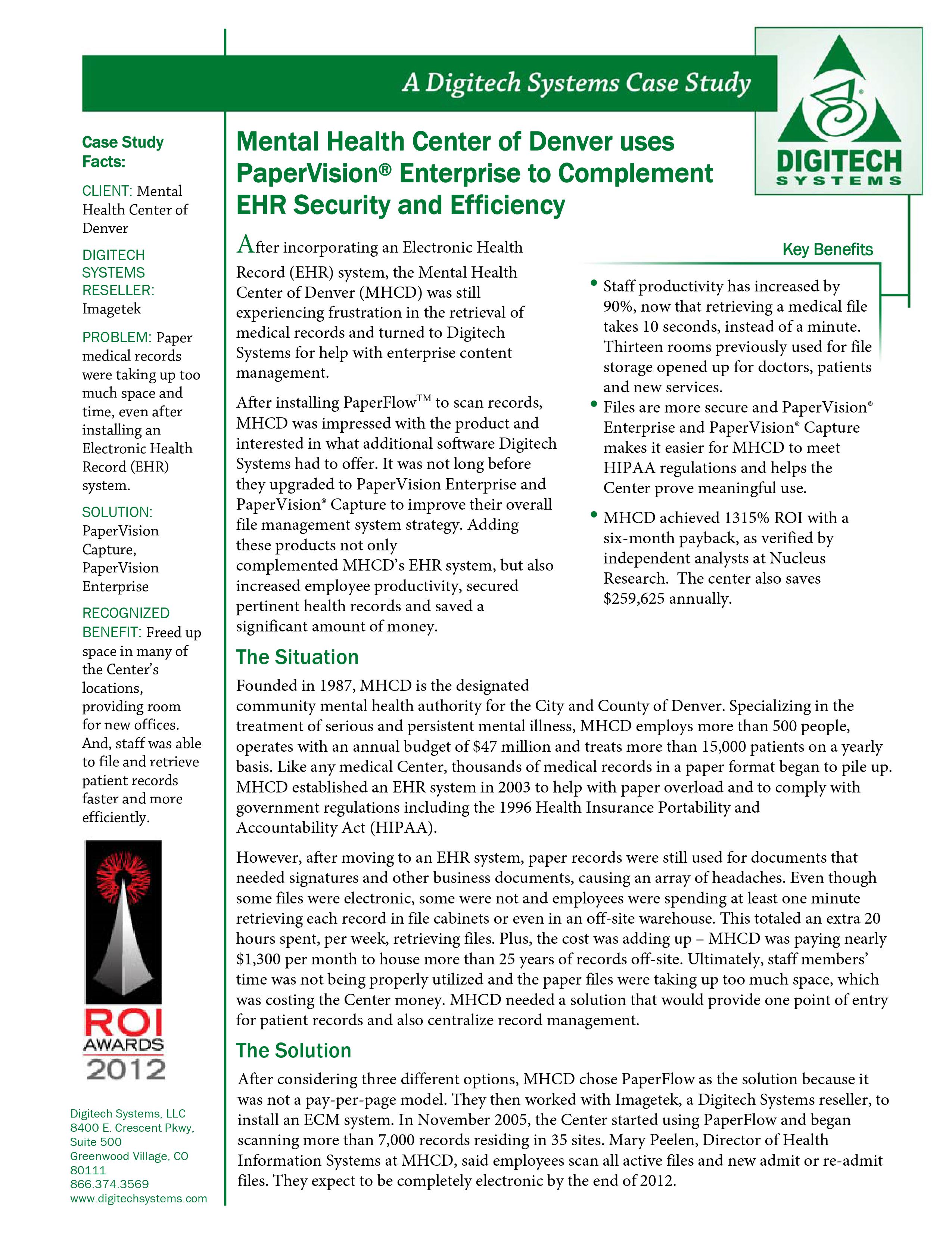 After considering different options, MHCD decided to work with Imagetek, a Digitech Systems reseller to move to an entirely digital system. They chose PaperVision® Capture to digitize their existing paper records and PaperVision® Enterprise, an on-premise Enterprise Content Management (ECM) system, to put its software robots to work and haven’t looked back since. “It takes so much less time now that the system routes and files patient files automatically for us. We would never go back to the way we did things before. Our goal is to never touch paper again,” said Mary Peelen, Director of Health Information Services.
