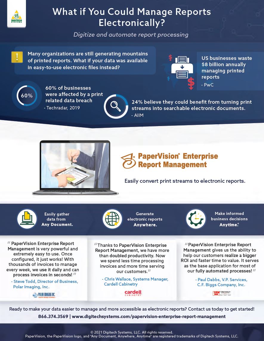 Contact us today if you’re ready to make your data easier to manage and more accessible as electronic reports. Download this helpful infographic to learn more about how PaperVision Electronic Report Management helps digitize and automate report processing.