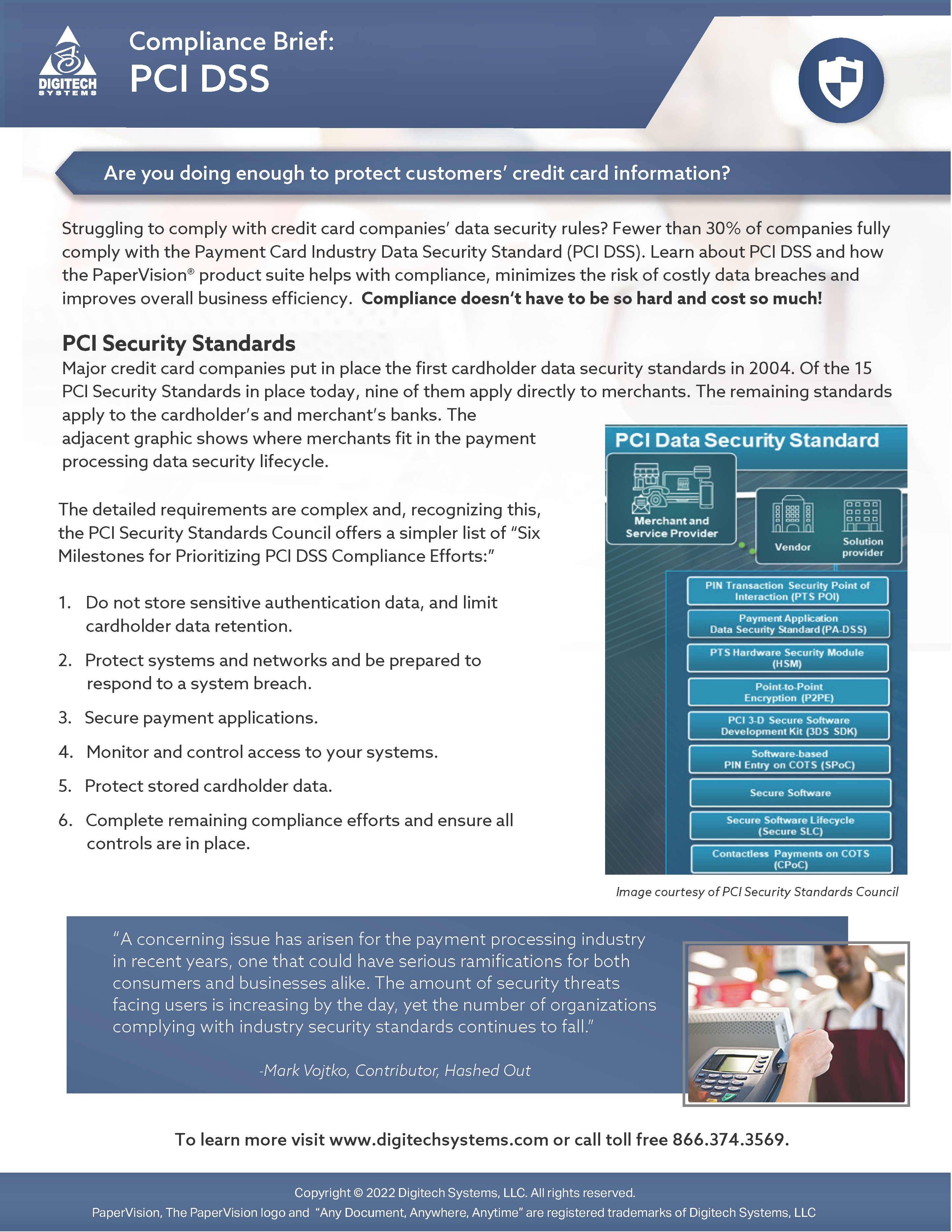 Improve your understanding of these important legal regulations with this easy-to-read two-page compliance brief that helps you match specific PCI DSS needs with the unique technology you need to reduce your legal vulnerability.