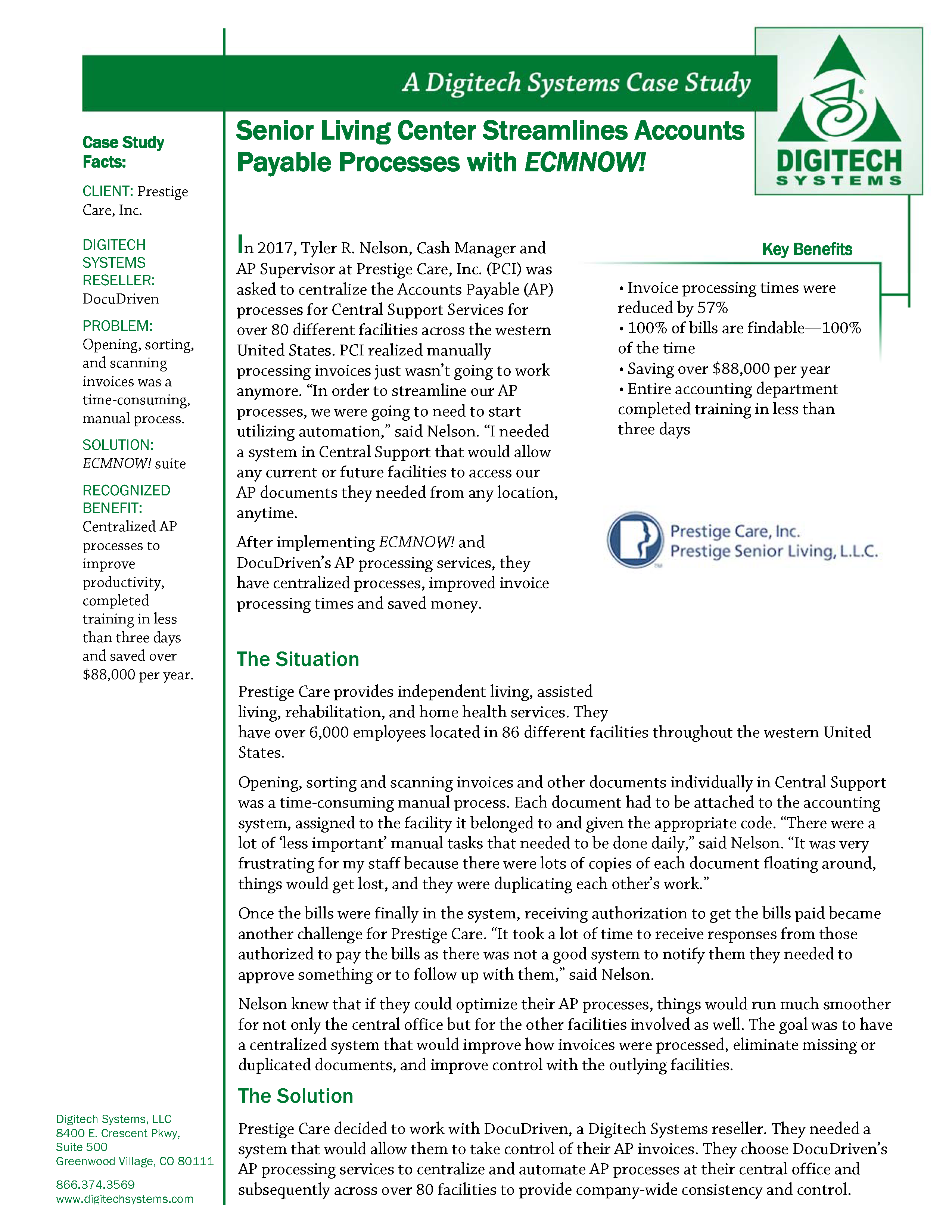 Prestige Care chose DocuDriven, a Digitech Systems reseller, to automate their AP processes. Thanks to the real-time integration between all systems, they can now process bills within one business day. “The time it takes us to process invoices has been reduced by 57%. We can now spend less time on accounts payable processing and more time providing the support our facilities really need,” said Nelson.