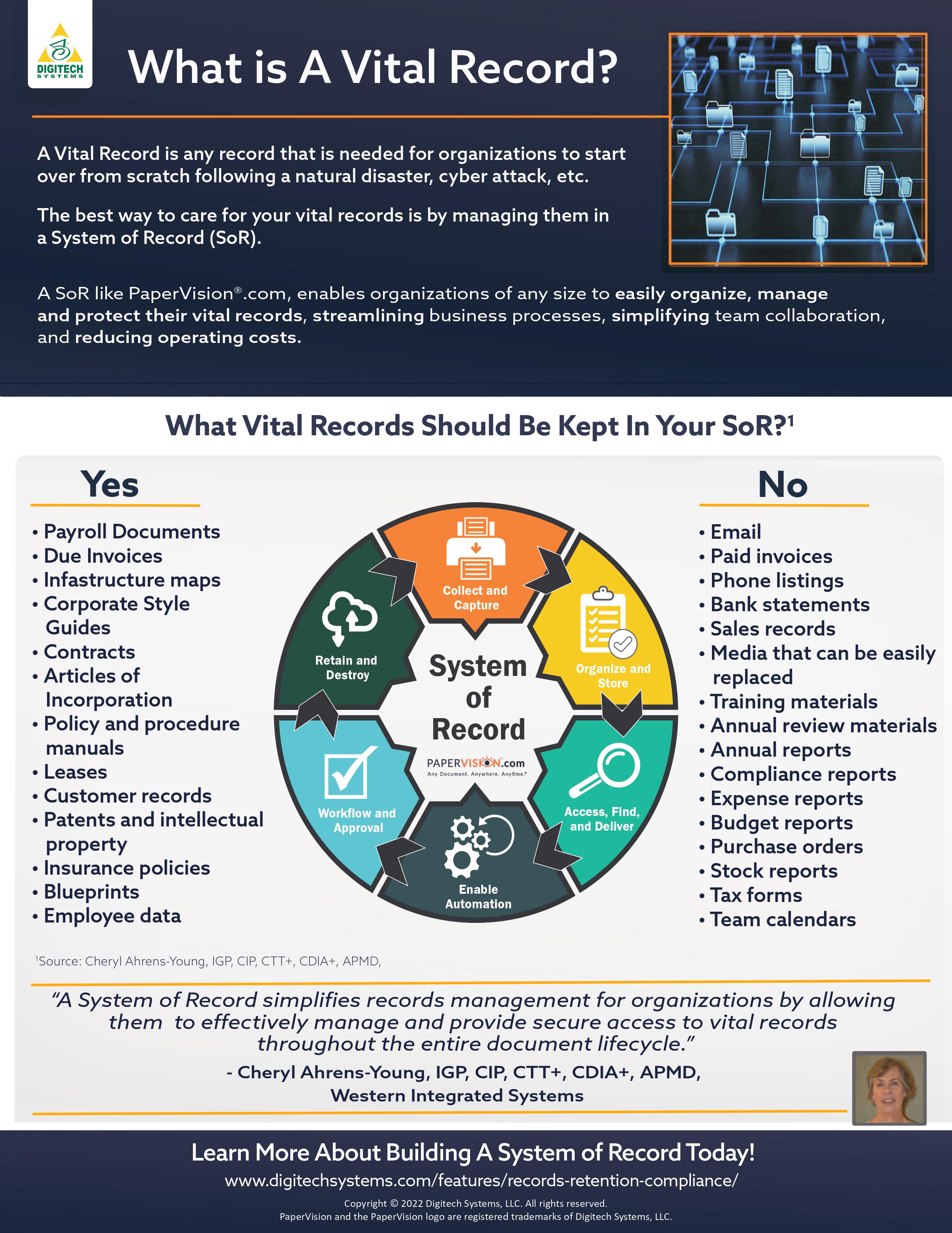 Vital records are critical to business operations. Knowing where vital records are is critical for organizations in case disaster were to strike. Historically, organizations have relied on a “keep everything” mentality when it comes to their critical business information out of fear that they may lose or need that information one day. This data hoarding mentality makes it difficult for organizations to effectively manage vital business records, which leads to information chaos. Can your organization confidently claim that your vital business records are in a consistent system? If not, it may be time to update your information management system. The most effective way for organizations to securely store, access, and retain vital records is with a System of Record (SoR).