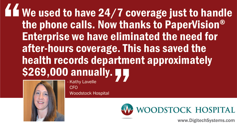 After noting this technology gap in Woodstock Hospital’s records management, Kathy Lavelle, former Director of Health Records and current CFO, expanded the hospital’s use of PaperVision® Enterprise to advance records storage, and added PaperFlowTM to handle their in-house scanning needs. This case study highlights the hospital’s success after implementing this more efficient records management solution with the help of Digitech Systems reseller Polar Imaging, Inc. For example, the hospital: